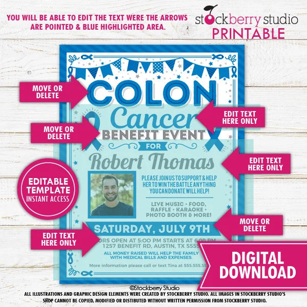 Editable S Blue Ribbon Benefit Fundraiser Flyer Printable Colon Cancer Awareness - Instant Download Printable