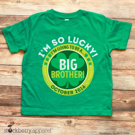 Personalized St Patrick's Day Big Brother Pregnancy Announcement Shirt (shown above) is printed on a Green T-Shirt 100% Cotton
